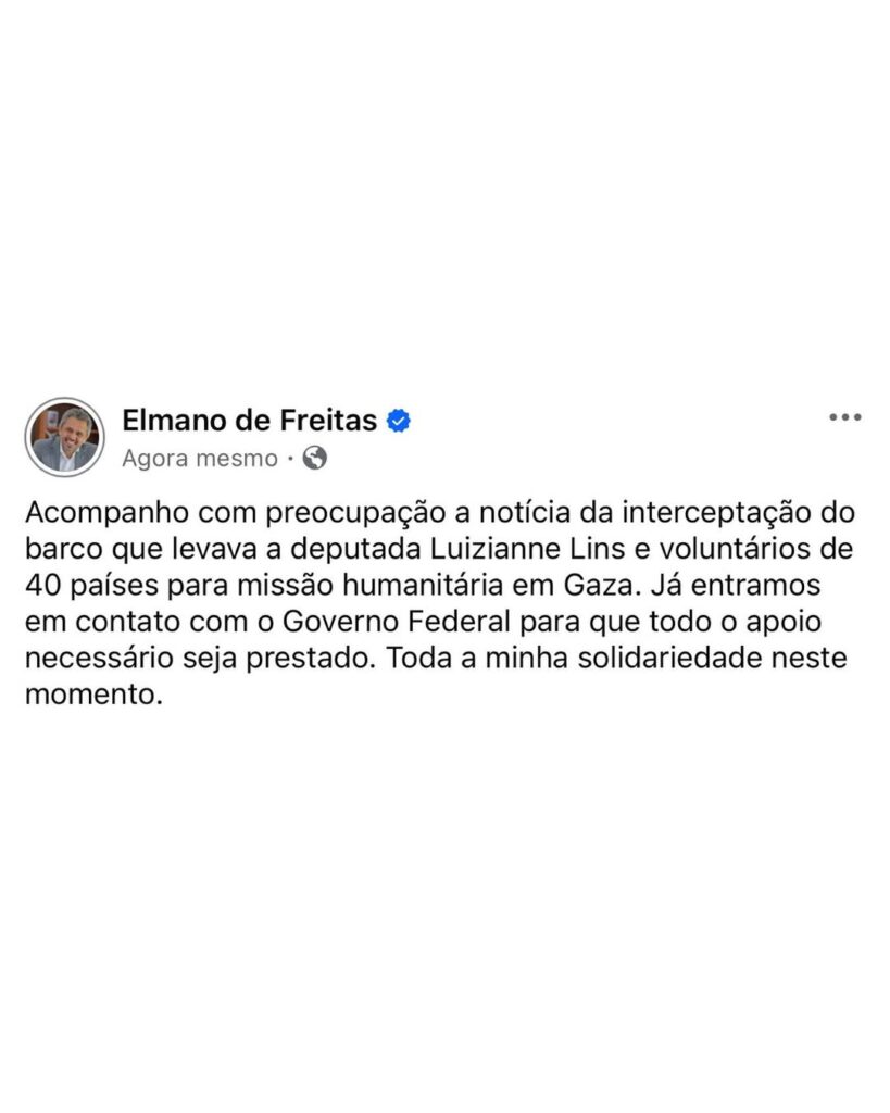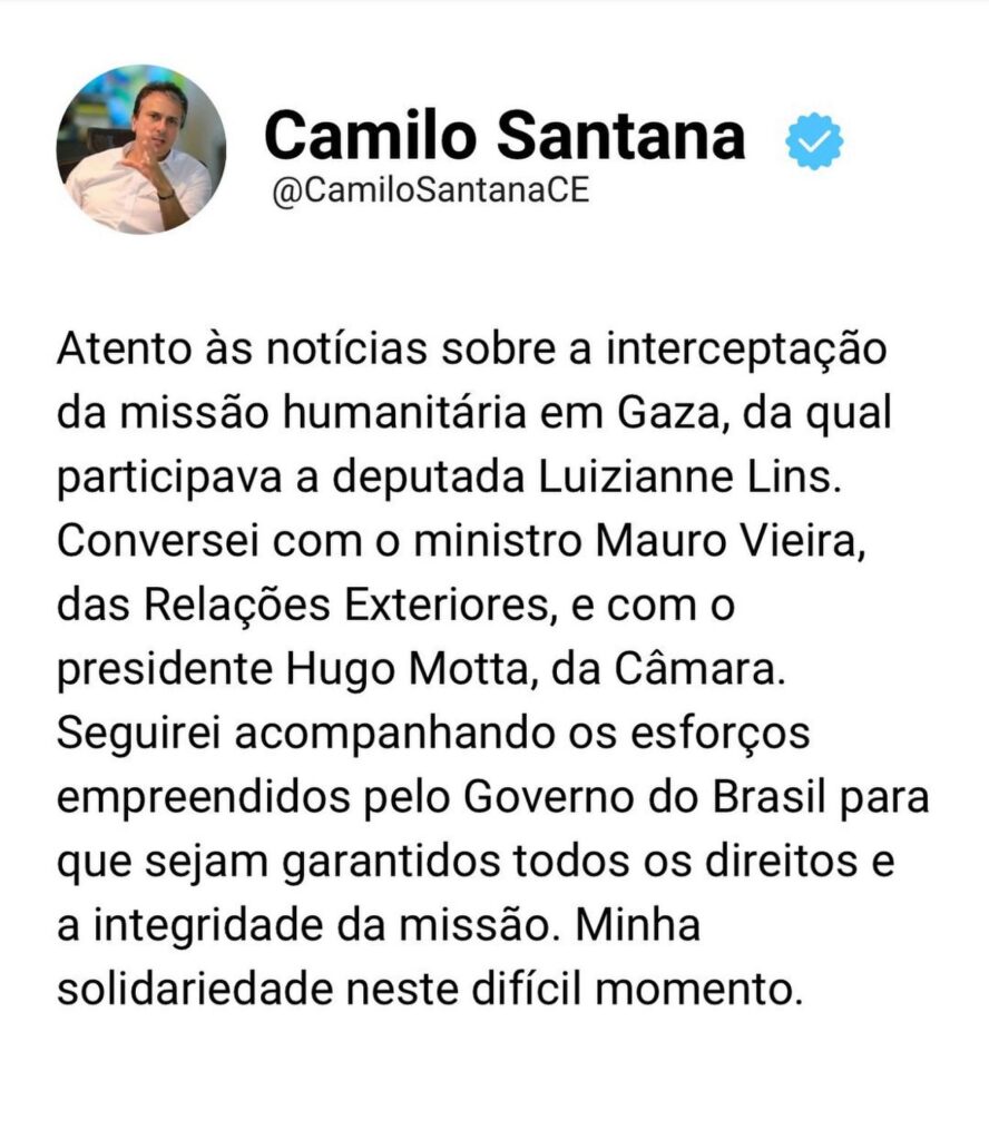 Diante das primeiras notícias de detenção de nacionais brasileiros a bordo de embarcações da flotilha, entre eles a deputada federal Luizianne Lins, o Brasil recorda o princípio da liberdade de navegação em águas internacionais e ressalta o caráter pacífico da flotilha.