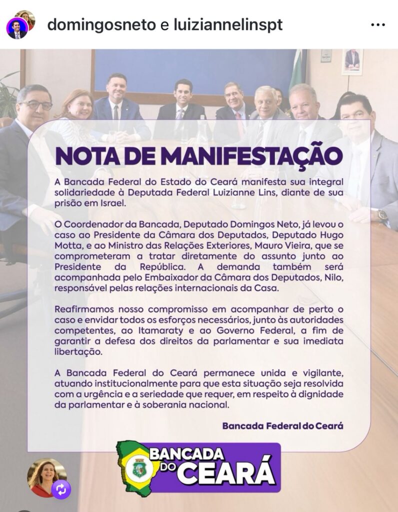 A Bancada Federal do Ceará divulgou nota em solidariedade à deputada e informou que acompanha o caso junto ao Itamaraty e ao presidente da República.
